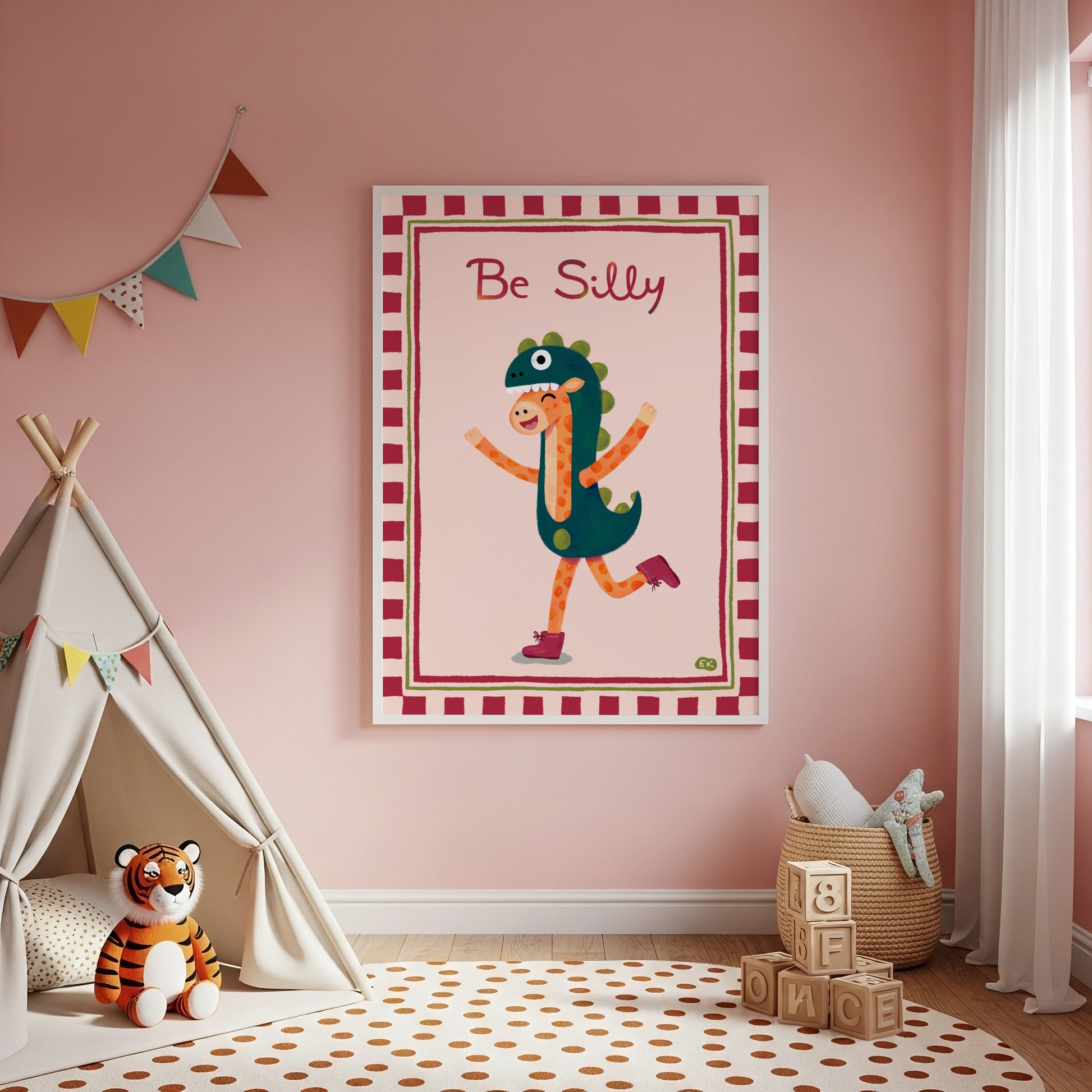 Be Silly is a joyful reminder that sometimes the bravest thing we can do is simply have fun, no matter who’s watching! This cheerful giraffe has decided to embrace the moment, dressing up in a big, bold dinosaur costume and stepping out with a happy heart.