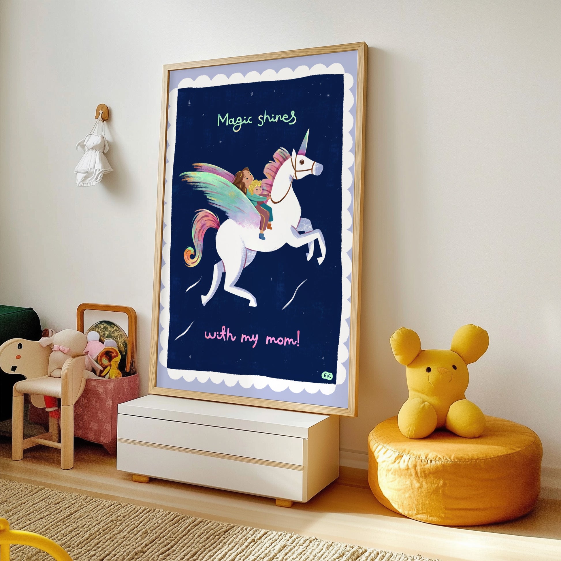 This print was born from a moment of imagination shared with my five-year-old daughter. When I asked her what I should draw, she said, “Draw you and me flying on a unicorn!” And so, this illustration came to life: A celebration of the magic that shines brightest when we’re together.
